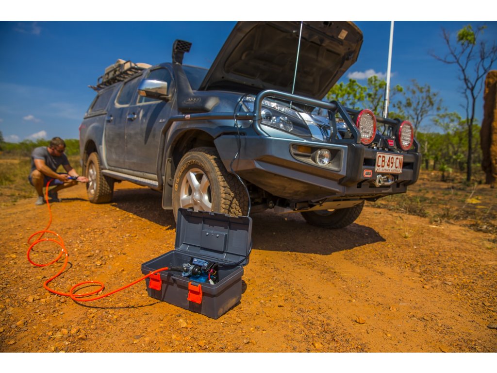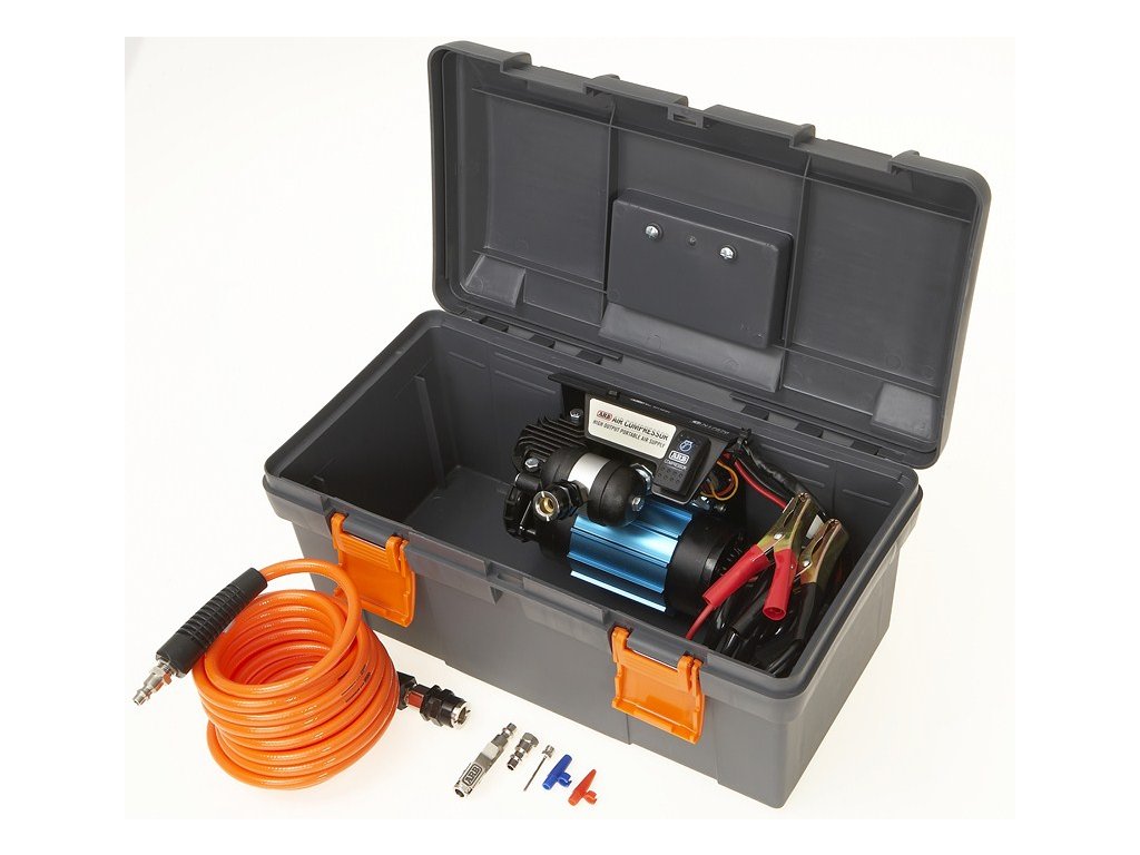 87,5 lt/min při 0 bar, 66 lt/min při 2 bar, váha 6,6 kg, odběr proudu 25A max, 440x238x208mm (š x d x v)ARB kompresor CKMP12 přenosný 12V v kufru a s příslušenstvím, s hadicí 6m