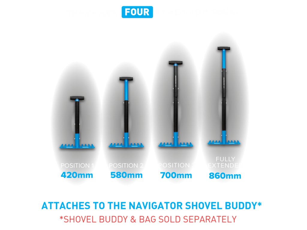 - Váha včetně nástavce je pouhých 300g a oboje se vejde do obalu lopaty Navigator Shovel Buddy - prodává se zvlášť
