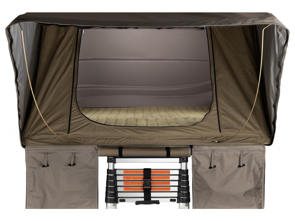 Rozložení a složení stanu se stalo opravdu hračkou. Díky pevnému krytu, který po odepnutí tří kurt pomohou zvednout plynové vzpěry, už zbývá jen pomocí zabudovaného teleskopického žebříku celý stan rozvinout. Možnost zabalení stanu i s rozloženým spaním.