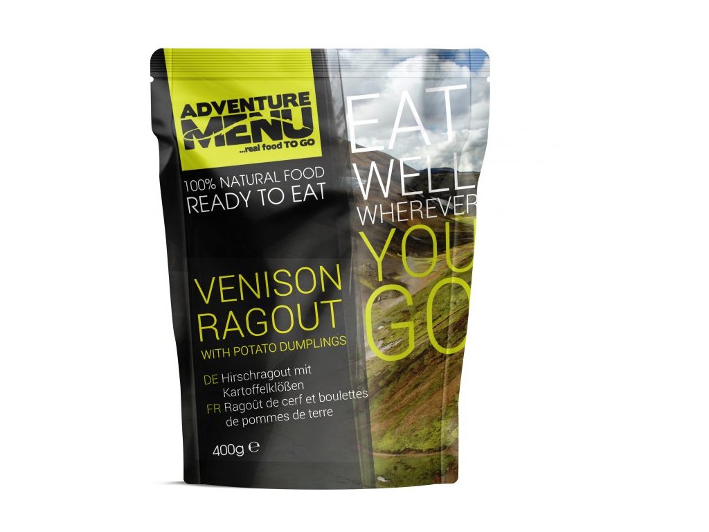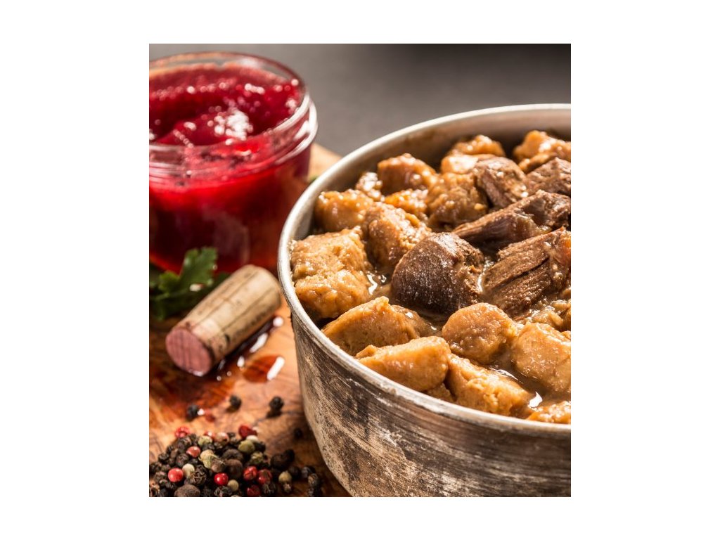 Jelení maso (30%), bramborové špalíčky (28%)bramborové špalíčky(28%) (pšeničná mouka, bramborové vločky /SO2/ , 30% pšeničná krupice, sůl, vaječná směs, koření) kořenová zelenina (mrkev, celer, petržel), cibule, červené víno, řepkový olej, rajský protlak (rajčata, sůl, cukr), rýžová mouka, kukuřičná mouka, rybízová marmeláda (rybíz, cukr, pektin), cukr, citronová šťáva, sůl, divoké koření.
