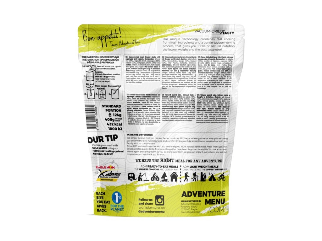 rýže Arborio (40%), zeleninový vývar, chřest (12%), brokolice (12%), červená paprika, šalotka, bílé víno, kešu ořechy, olivový olej, lahůdkové droždí (sušené kvasnice, sladový extrakt), česnek sušený, sůl, pepř
