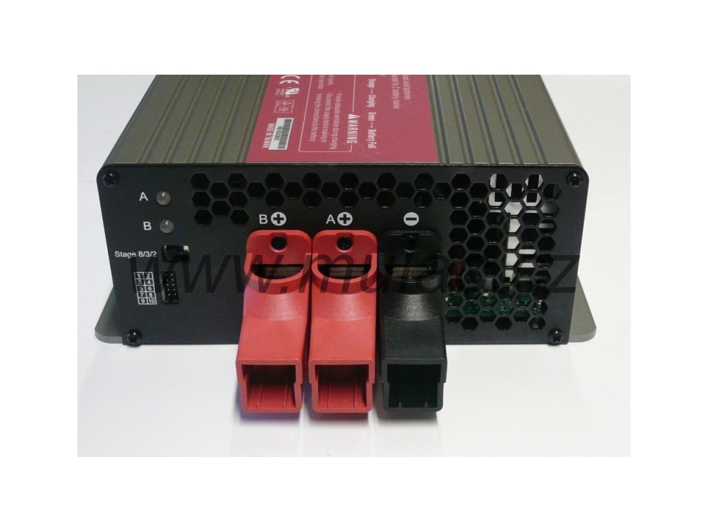Plně automatický nabíječ PB-1000-24 pro profesionální nebo velmi časté použití. Nabíječ pro 24V trakční, staniční, nebo startovací akumulátory s výkonem 1000W / 34,7A. Nabíječ se dodává bez vstupních a výstupních kabelů. Hlavní vlastnosti (_datasheet PB-1000-24_): Nabíjení je řízeno mikroprocesorem 2/3/8 fázové nabíjení volitelné uživatelem Teplotní kompenzace nabíjení Univerzální vstupní AC napětí (90~264VAC nebo 127~370VDC) Zabudovaný aktivní PFC, PF>0,95 Ochrany: přepolování, zkrat, přepětí, přehřátí 3 barevná LED indikace Zabudovaná funkce vzdáleného zapnutí a vypnutí, indikace stavu nabíjení atd. Možnost nabíjet dvě baterie nezávisle na sobě Otáčky ventilátoru řízeny Technická specifikace: Nabíjecí napětí: 28,8V Udržovací napětí: 27,6V Výstupní maximální proud: 34,7A Doporučená kapacita nabíjené baterie: 120-350Ah Vstupní napětí: 90~264VAC (47-63Hz) nebo 127~370VDC Nabíjecí možnosti: 2/3 nebo 8mi fázové nabíjecí programy Pracovní teplota: -20- +60°C Pracovní vlhkost: 30-90% nekondensující Bezpečnostní standardy: UL60950-1, TÜV EN60950-1 MTBF (střední doba od poruchy k poruše): 127.000hodin, 14,5 roku Rozměry: 300/184/70 mm Hmotnost: 3,5Kg Součástí výrobku NENÍ přívodní šňůra na 230V, ke zdroji se NEDODÁVAJÍ kabely pro připojení k bateriím resp. vozidlu.Doplňkové parametry