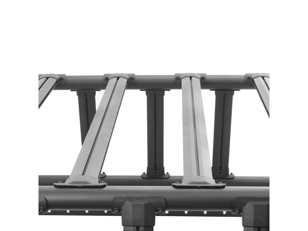 Střešní nosič Go Rhino XRS Xtreme Rack přináší technologii 4-CORE pro neomezené možnosti přepravy nákladu a vybavení při expedicích. 4-CORE je extrudovaný systém drážkovaných lišt, který umožňuje použití libovolného šroubu s šestihrankou M6, což znamená, že na střešní nosič lze snadno připevnit téměř jakékoliv příslušenství. Kombinace oceli a hliníku nabízí vysokou pevnost a zároveň úsporu na váze, což umožňuje bezpečně namontovat střešní stan a ostatní vybavení.