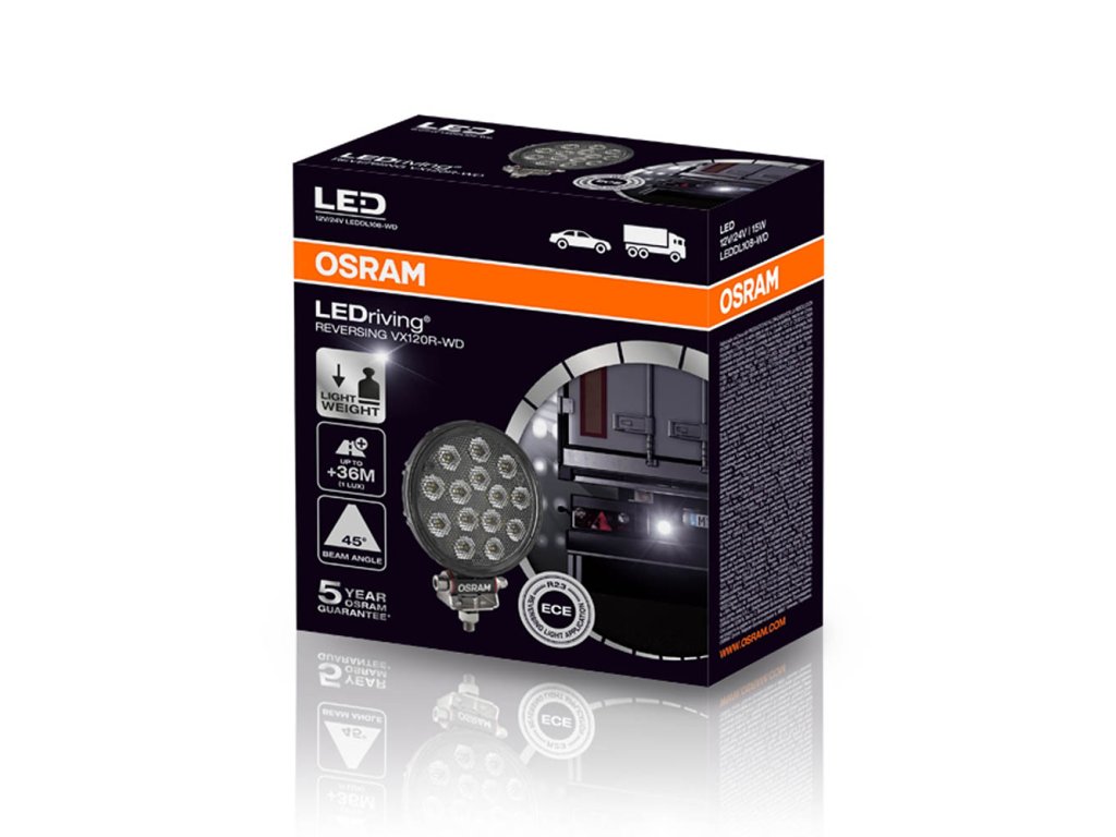 Ať už na silnici nebo v terénu - OSRAM LEDriving Reversing VX120R-WD couvací světlo zaujme svým výkonem a dlouhou životností. Univerzálně použitelný, vzdoruje mnoha vlivům prostředí a díky vysoce kvalitním materiálům, jako je termoplastické pouzdro a stabilní polykarbonátová čočka, je obzvláště lehké a zároveň robustní a odolné. LEDdriving VX120R-WD zpětné světlo bylo testováno a ověřeno s třídou ochrany IP69K v naší laboratoři pro simulaci prostředí s certifikací DIN pro extrémní vnější vlivy na vodu, prach, nárazy, teplo, chlad a trvalé vibrace. Integrovaný systém chlazení reguluje teplotu led zpětného světla a může tak zabránit přehřátí a poškození. Ochrana proti polaritě vylučuje nesprávnou polaritu napájecího napětí a může tak zabránit možnému poškození automatickým vypnutím LED diod. Terénní OSRAM LEDriving ReversingVX120R-WD couvací světlo je účinným doplňkem vašeho vozidla. Pro tato LED zpětná světla s certifikací ECE není nutná žádná registrace ani zápis do dokladů vozidla.