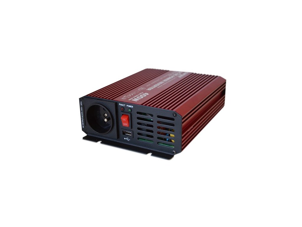 Tento sinusový měnič napětí dodává čistě sinusové výstupní napětí, stejné jako ze zásuvky 230V. Můžete tedy na něj připojit jakýkoliv spotřebič. Měnič je vhodný pro spotřebiče s elektromotorem (elektrické nářadí, vrtačky) nebo s induktivním zatížením (čerpadla, transformátory). Měnič má náeldující funkce a ochrany:Ochrana uzemnění, ochranu proti opačné polaritě, přetížení, přepětí, vysoké teplotě, nízkému napětí, zkratuUSB výstup 5V / 500mA, může nabíjet váš mobilní telefon a digitální zařízeníPWM vysoko-frekvenční technologie, malé rozměry, velký výkon Technické údaje: Výstup: 400W (trvalý) / 800W (špičkový) / USB 5V/500mAVýstupní proud: 33 A (max.)Frekvence: 50 HzTvar výstupního napětí: sinusoidaNapájení: 9,5-16V DCRozměry: 260 x 150 x 58mmHmotnost: 1600 gDoplňkové parametry