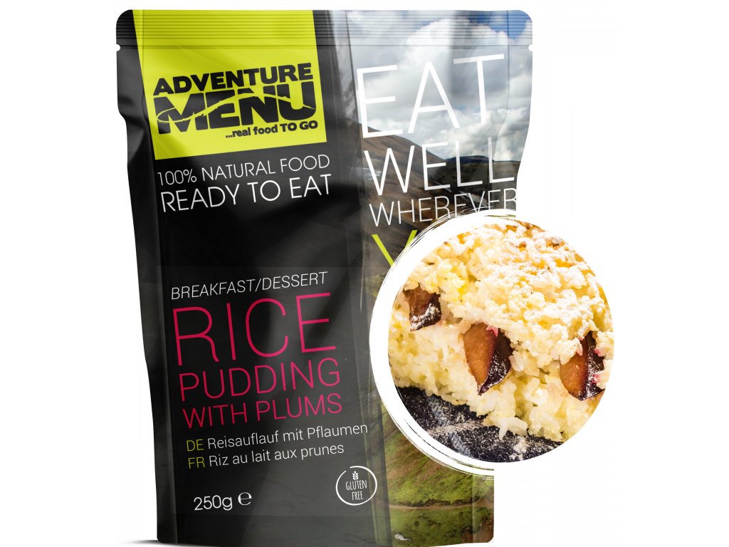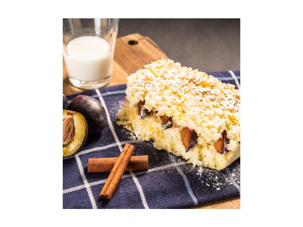 mléko, švestky kompotované (24%)(švestky, voda, cukr), rýže ( 15 %), cukr, vejce, máslo, sůl, skořice.