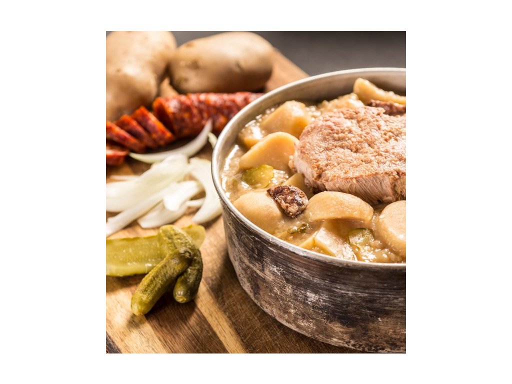 brambory (36%), vepřová kotleta (30%), papriková klobása ( vepřové maso, sůl, paprika, kmín, česnek) , okurky sterilované znojemské (okurky, ocet kvasný, sůl, extrakt koření, náhradní sladidlo sacharin, hořčičné semínko), mouka rýžová, mouka kukuřičná, cibule, řepkový olej, sůl, pepř