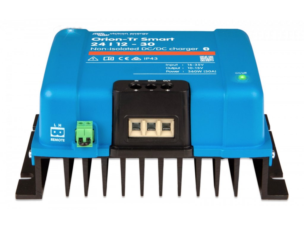 Orion-Tr Smart DC-DC nabíječ je profesionální DC/DC nabíječ (neizolovaný-společné mínus) s 3 fázovou adaptivní nabíjecí charaktreristikou, kterou lze plně uživatelsky nastavit pomocí vestavěného Bluetooth rozhraní (1). Zařízení lze také nastavit a používat jako napájecí zdroj s nastavitelným napětím. Tento nabíječ je určen pro nabíjení druhé baterie v systémech s běžným alternátorem, ale i chytrým alternátorem, který je nastaven k minimalizování spotřeby paliva a dobíjí baterii například jen při jízdě z kopce. Tyto alternátory dodávají velmi proměnlivé napětí a jsou často vypínány. Řízená nabíjecí charakteristika je také vhodná pro použití s lithiovými bateriemi, které jinak mohou přetěžovat alternátor. Nabíječ lze nastavit tak, aby nabíjel druhou baterii pouze v případě, že je nastartovaný motor, detekční hladiny napětí lze opět libovolně nastavit. Nebo jej lze "natvrdo" ovládat spínačem zapalování. Adaptivní 3 fázový nabíjecí algoritmusNabíječ automaticky upravuje a kontroluje dobu, po kterou trvá absorpční nabíjecí program. Tím zabraňuje přebíjení lehce vybité baterie a naopak u hluboce vybité baterie, je tato doba delší, aby baterie byla plně dobita. Všechny modely jsou zkratuvzdorné a mohou být řazeny paralelně (libovolné množství), k navýšení výstupního výkonu. Orion-Tr Smart mají teplotní ochranu, upravují výstupní výkon s ohledem na svoji teplotu, aby nedošlo k poškození zařízení. Použitelné jsou až do teploty 55°C, přičemž plný výkon poskytují až do teploty 40°C PARAMETRY ORION-TR SMART DC-DC 24/12-17A neizolovaný (společný mínus) Vstupní napětí (2): 20-35 VVypnutí při podpětí: 14 V, restart: 15 VJmenovité výstupní napětí: 24,2 V (při nastavení jako napájecí zdroj)Rozsah nastavení výstupního napětí: 20-30 VTolerance výstupního napětí: +- 0,2 VJmenovitý výstupní proud až do teploty 40°C: 17 AMaximální výstupní proud (10s) při jmenovitém výstupním napětí: 25 AZkratový výstupní proud: 40 ATrvalý výstupní výkon při 25°C: 480 WTrvalý výstupní výkon při 40°C: 400 WÚčinnost: 89 %Spotřeba na prázdno: < 100 mAGalvanická izolace mezi vstupem a výstupem: ano, 200V mezi vstupem/výstupem a skříní.Pracovní teplota: -20 až +55°C (snížení výkonu o 3% na každé % nad 40°C)Připojení kabelů: šroubovací svorky pro kabely max 16mm2Hmotnost: 1,8 kgRozměry: 130 x 186 x 80 mmKrytí proti vodě: IP43 při instalaci šroubovými svorkami směrem dolůNORMY:Bezpečnost: EN 60950Emise: EN 61000-6-3, EN 55014-1Odolnost: EN 61000-6-2, EN 61000-6-1, EN 55014-2Homologace: ECE R10-5Normy se mohou během času měnit a doplňovat další 1) Stáhněte si z obchodu Google Play aplikaci VictronConnect, jděte do menu Demo library, vyberte si produkt Orion Smart a vyzkoušejte si všechny možnosti nastavení ORION-TR SMART DC-DC na Vašem mobilu.2) Pokud je výstupní napětí nastaveno na jmenovitou hodnotu, nebo níže, zůstává stabilní v celém rozsahu vstupního napětí (v režimu "napájecí zdroj"). Pokud výstupní napětí nastaveno o několik procent výše nad jmenovitou hodnotu, pak se hodnota minimálního vstupního napětí, při kterém je výstupní napětí stabilní, zvedá o stejnou procentní hodnotu.Doplňkové parametry
